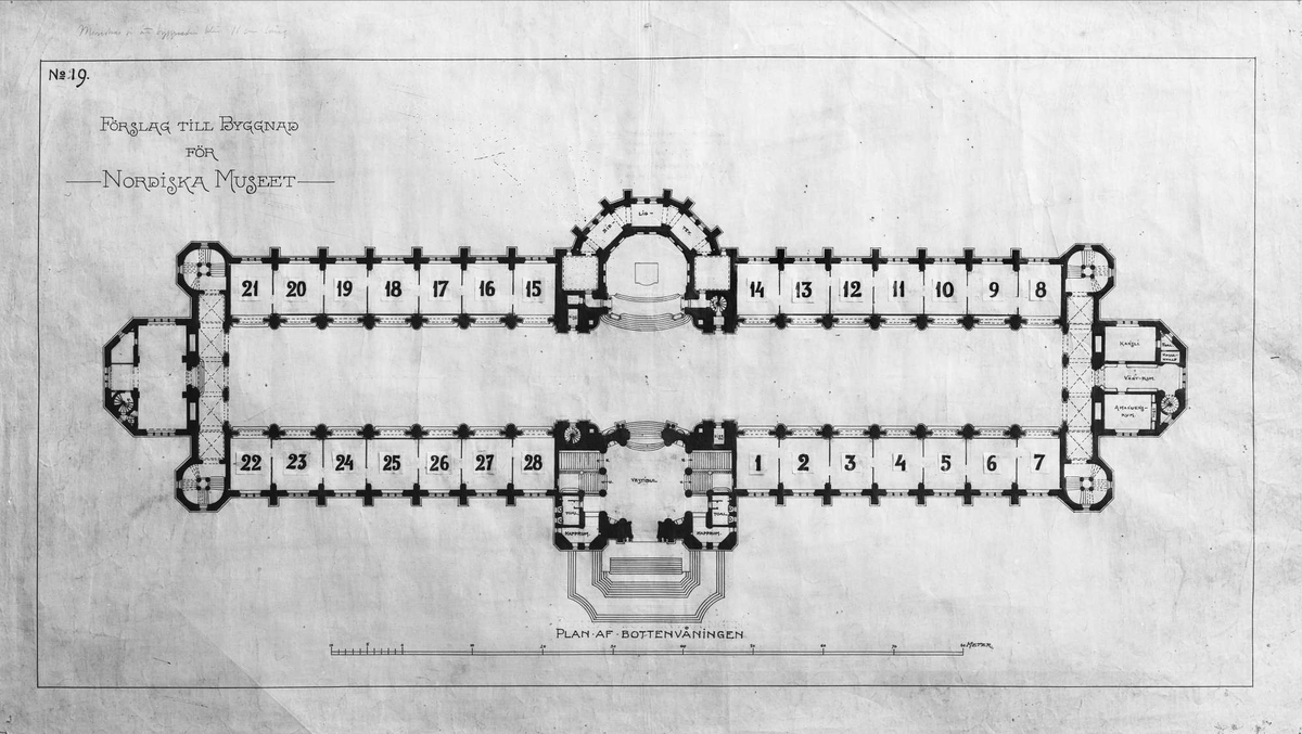 Nordiska museet. I.G. Classons vinnande förslag. Planskiss av bottenvåningen. Biblioteket är markerat i absiden.