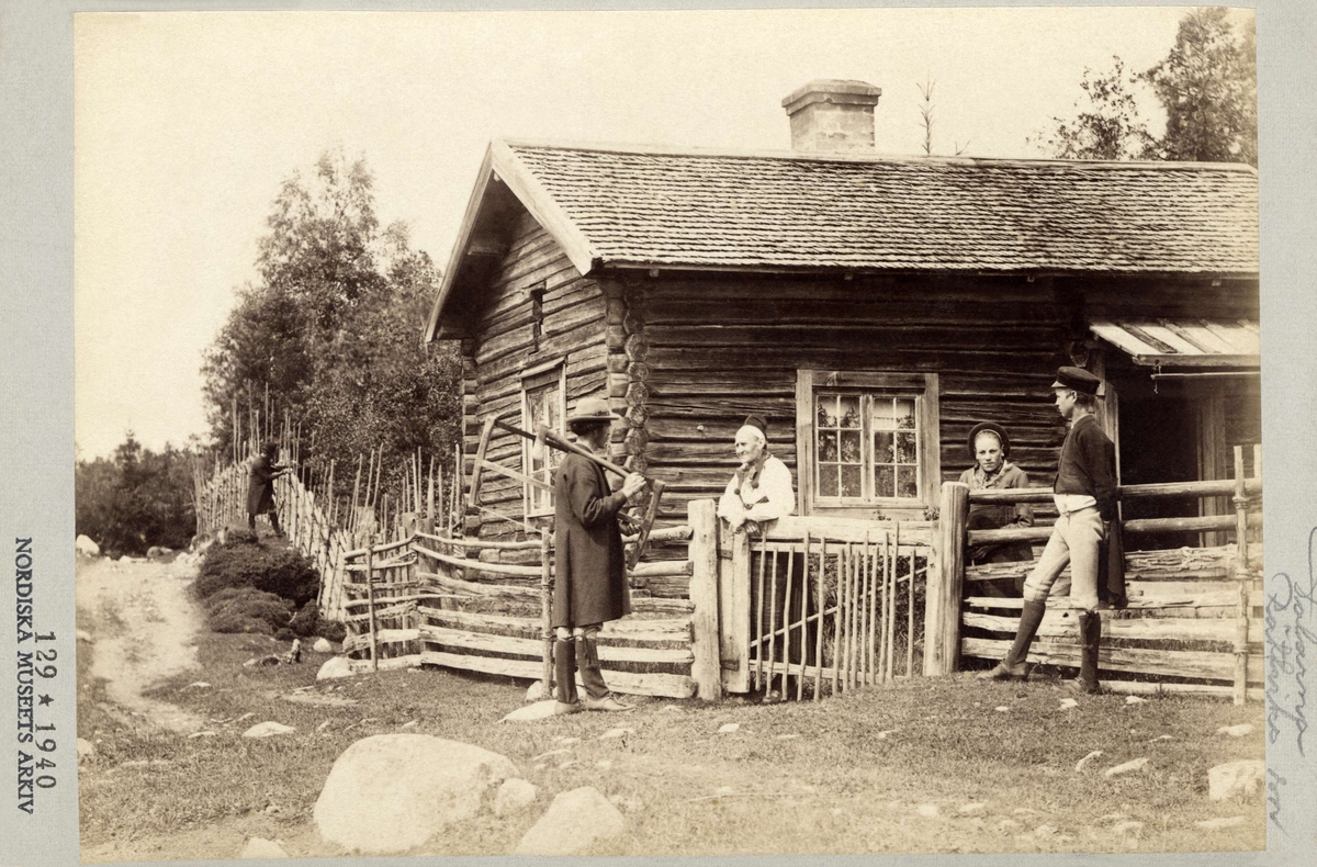 Människor samtalar utanför ett hus som är omgärdat av en gärdsgård.