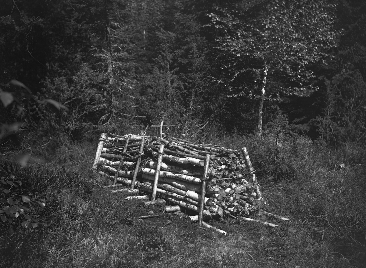 Dokumentation av arbete med kolning i Bogens kapellförsamling i Värmland. En färdiglagd liggmila. I mitten ett "tändkors".