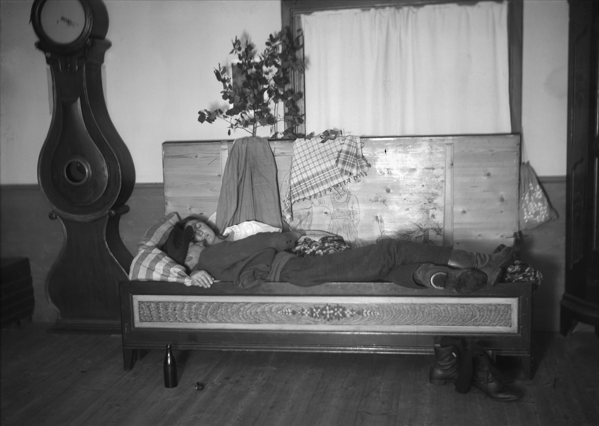 Nattfrieri. Man och kvinna sover i säng. Värmland, Mangskogs sn.