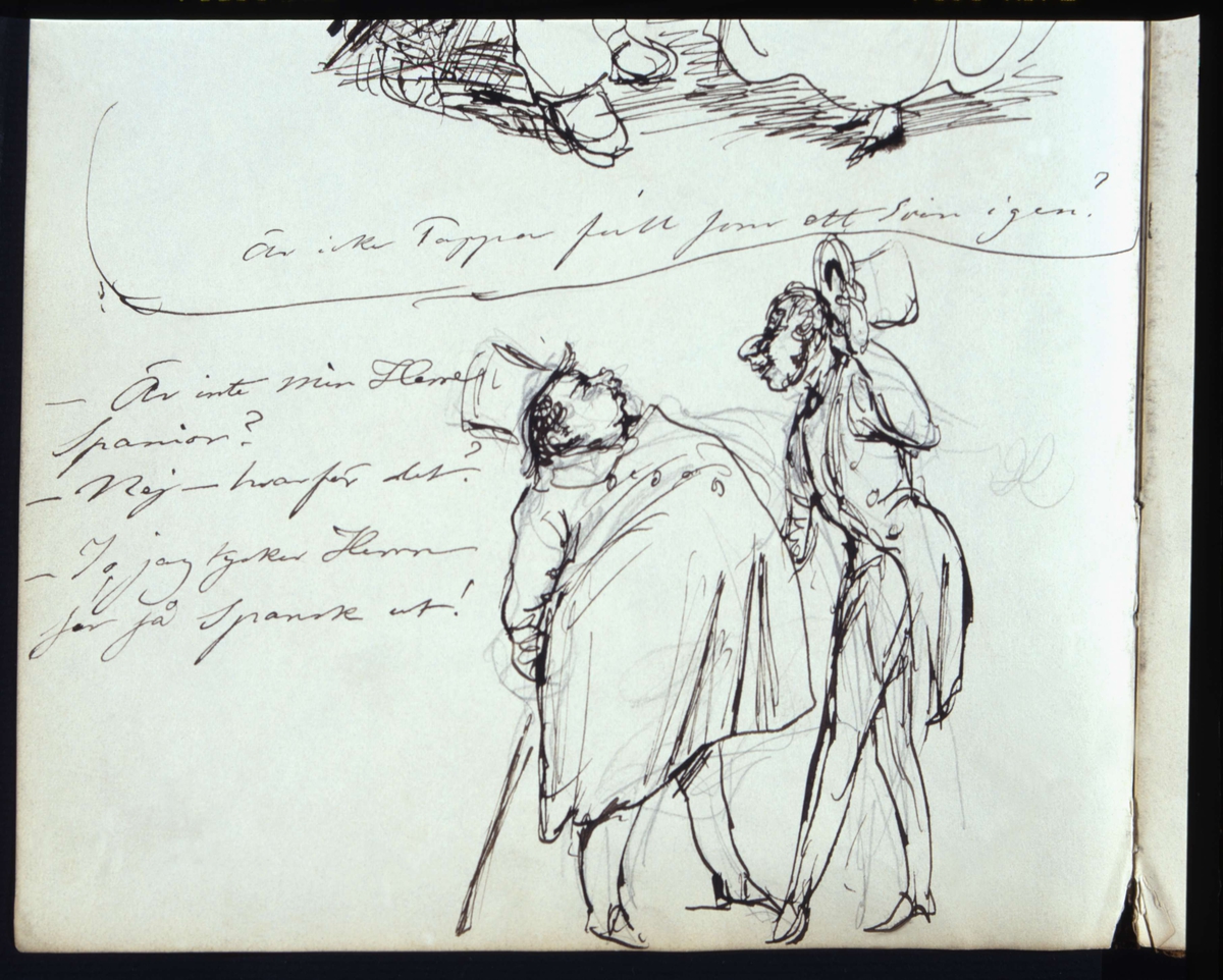 "-Är inte min herre spanior? -Nej hvarför det? -Jo jag tycker herrn ser så spansk ut". Tuschteckning av Fritz von Dardel.
