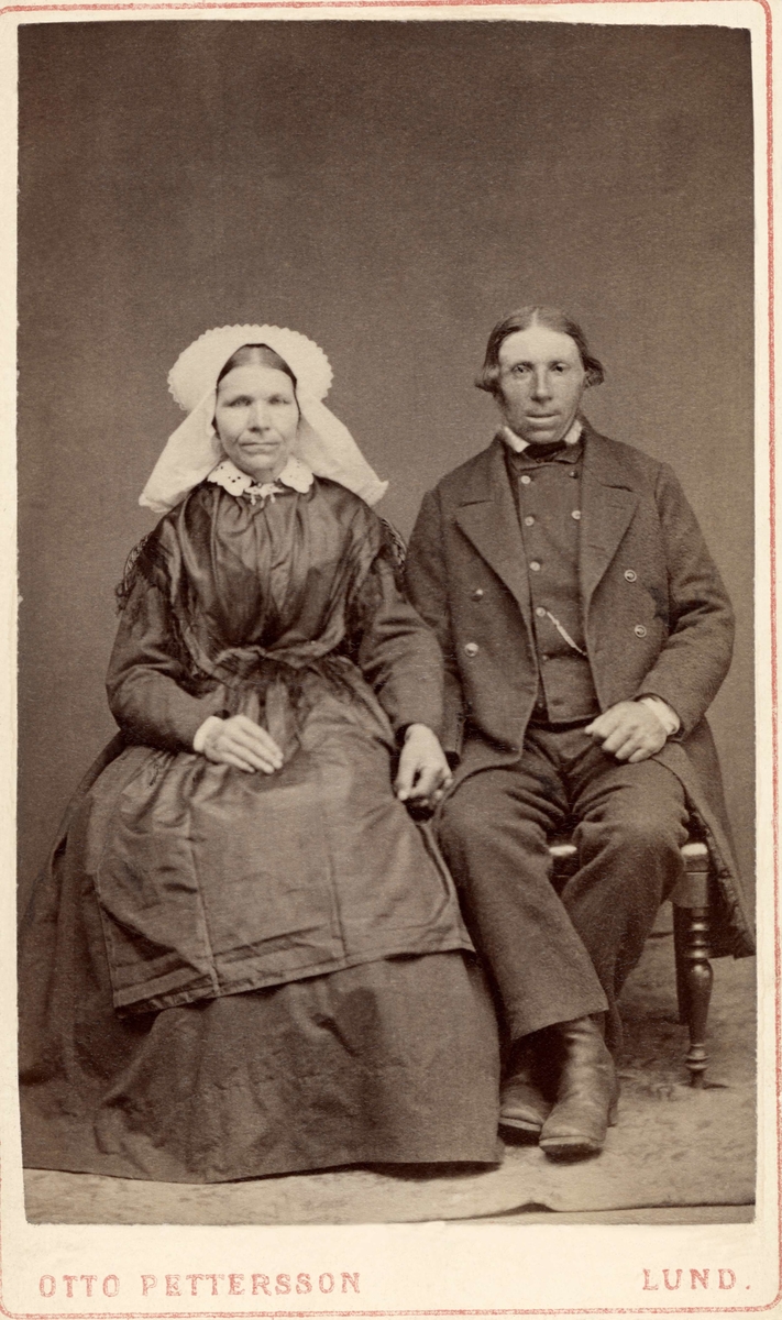 Ett par poserar för fotografen klädd i tidstypiska kläder