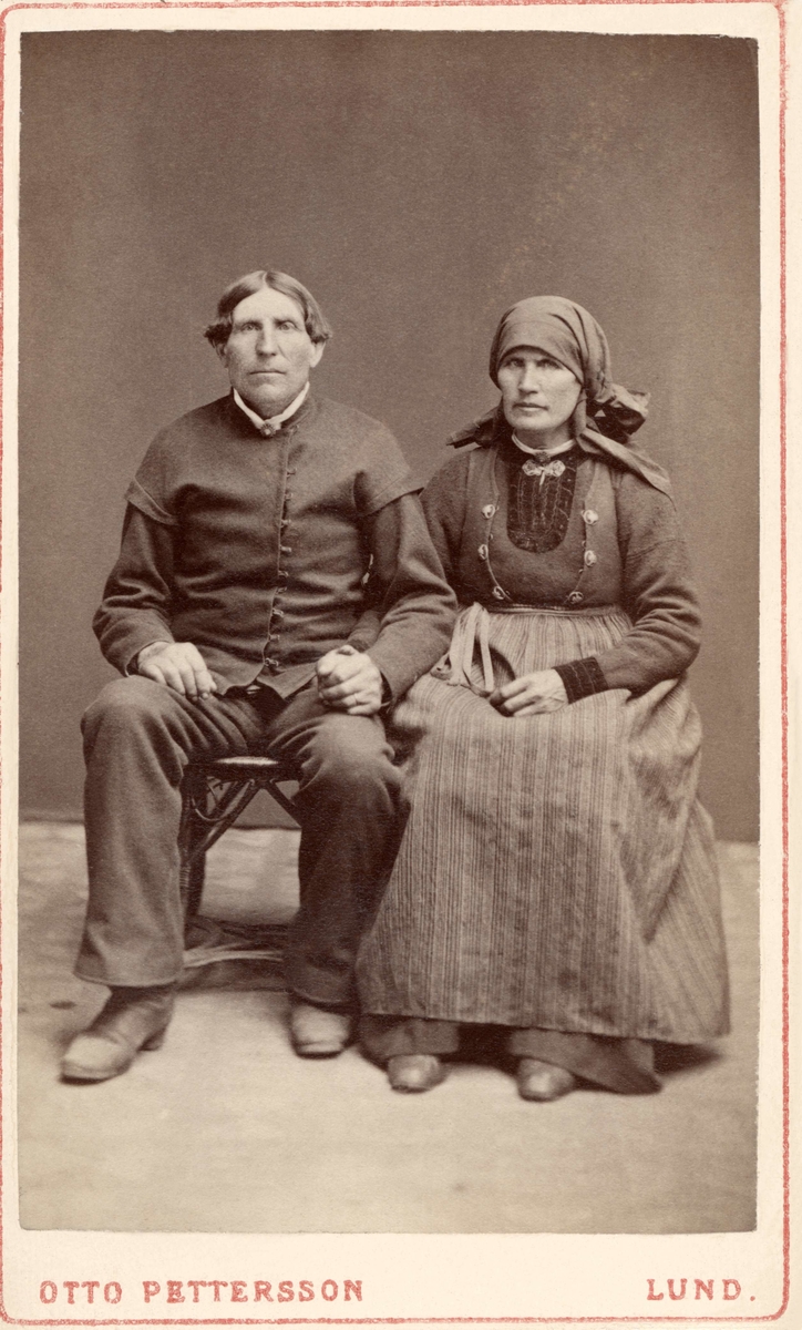 Ett par poserar för fotografen klädd i tidstypiska kläder
