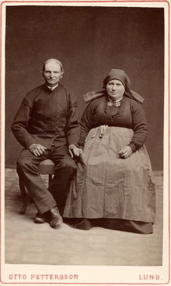 Ett par poserar för fotografen klädd i tidstypiska kläder