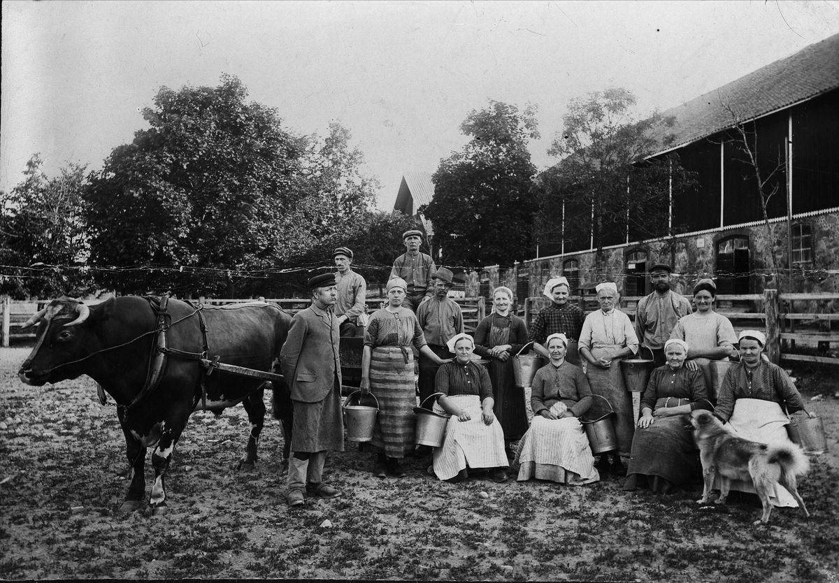 Statare. Mjölkerskor och lagårdskarlar uppställda vid ladugården. Julita gård, Södermanland.