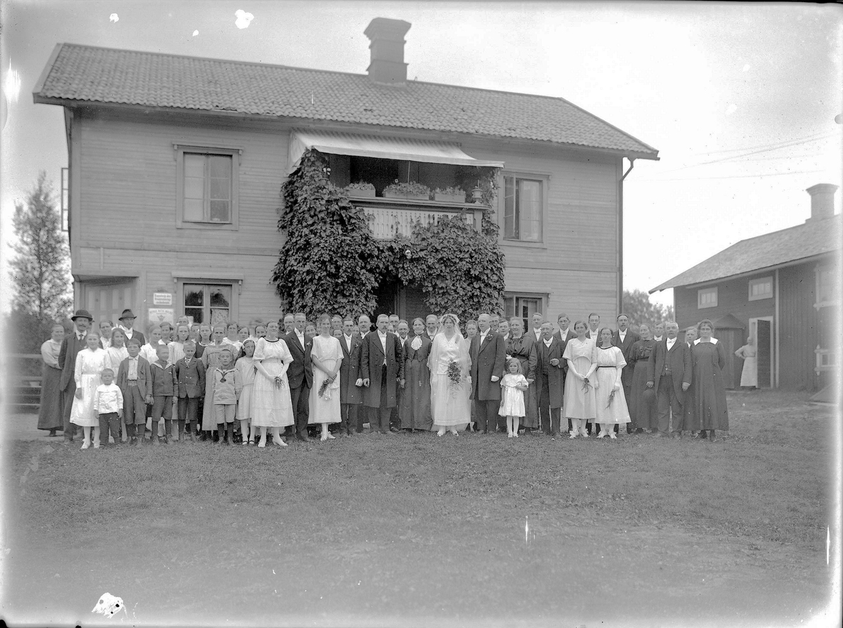 Gruppfoto framför hus med brudparet i mitten, tidigt 1900-tal. Lima, Dalarna