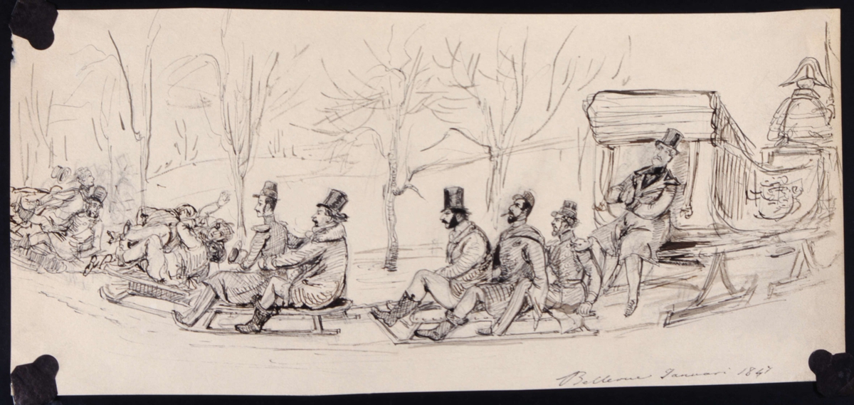 "Bellevue januari 1847". Kälkåkning. Tuschteckning av Fritz von Dardel, 1847