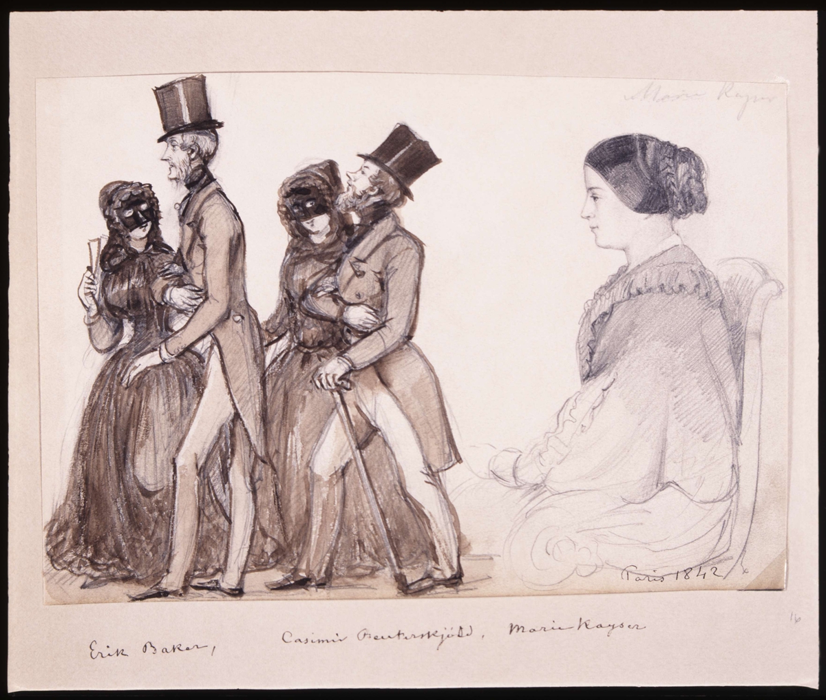 "Människor på väg till en maskerad". Eric Baker, Casimir Reuterskjöld, Maria Kayser. Paris 1842. Sepia, blyertsteckning av Fritz von Dardel.
