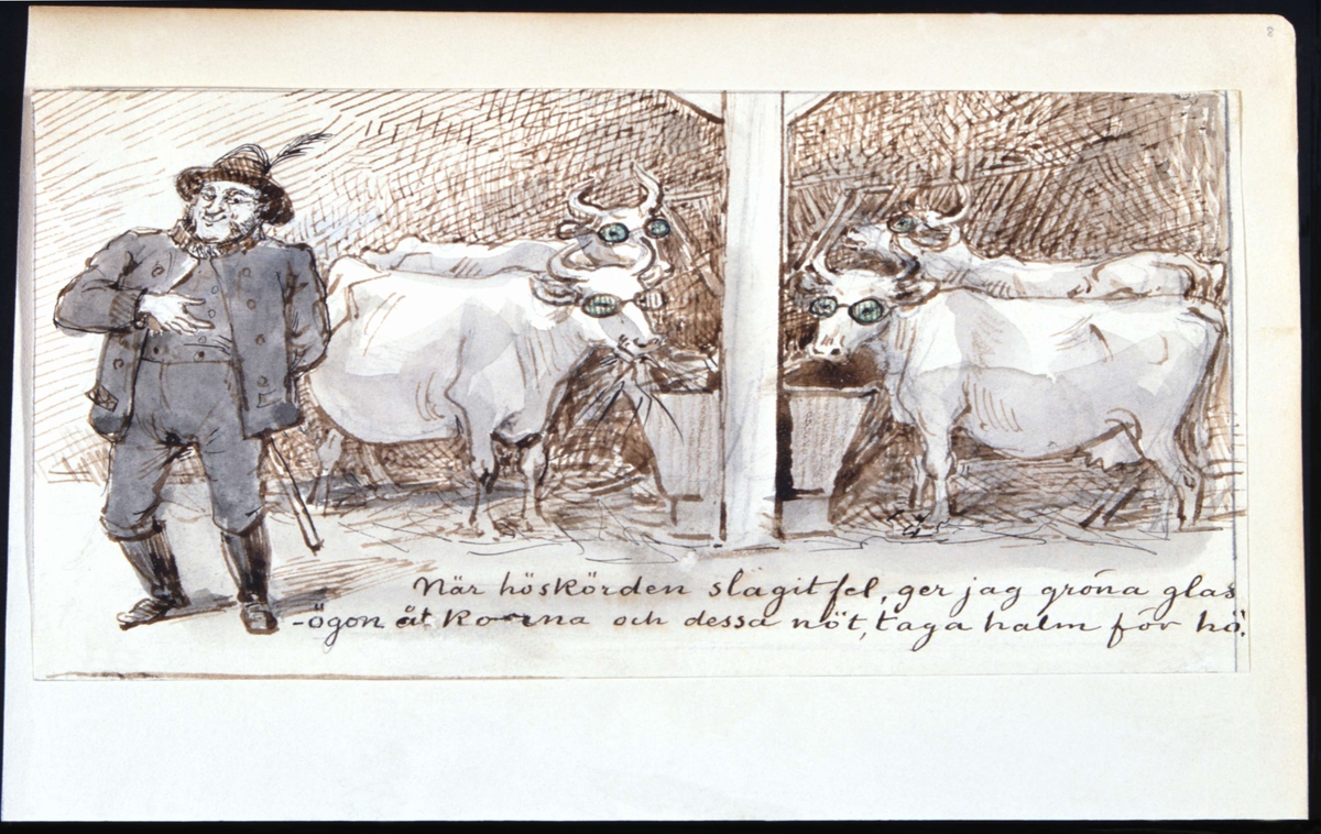 "När höskörden slagit fel, ger jag gröna glasögon åt korna och dessa nöt taga halm för hö". Teckning av Fritz von Dardel.