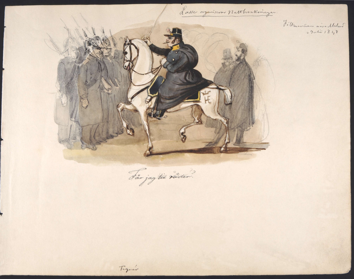 "Lasse organiserar nattbevakningen. Fältmanövern nära Malmö 2 julii 1848. 'Får jag tie råder?'" Lars Gustav Tegnér (1814-1874) till häst med dragen sabel. Tuschlavering av Fritz von Dardel.