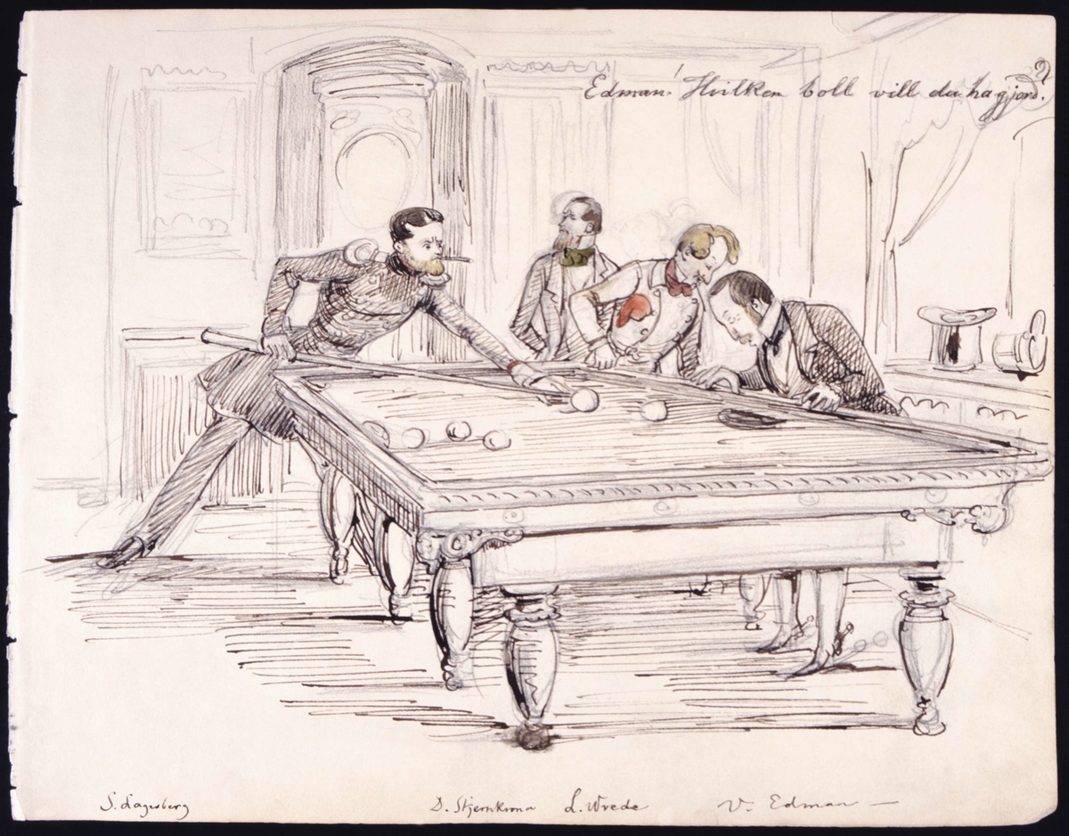 "Edman! Hvilken boll vill du ha gjord". Biljardscen. Tuschteckning av Fritz von Dardel