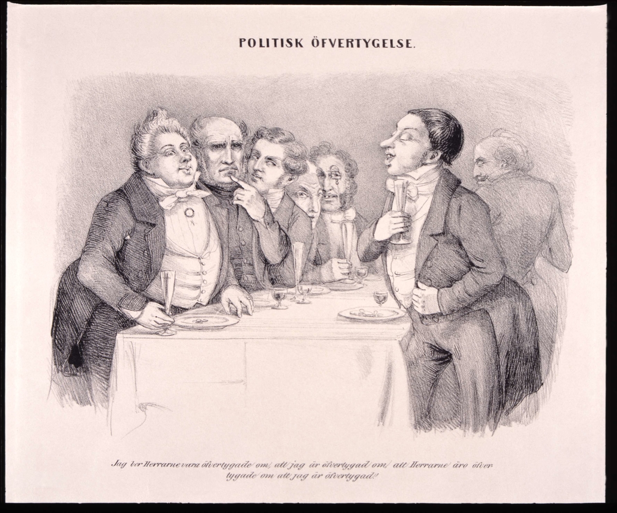 "´Politisk Öfvertygelse´. Jag ber Herrarne vara öfvertygade om att jag är öfvertygad om att Herrarne är öfvertygade om att jag är öfvertygad." Litografi av Fritz von Dardel