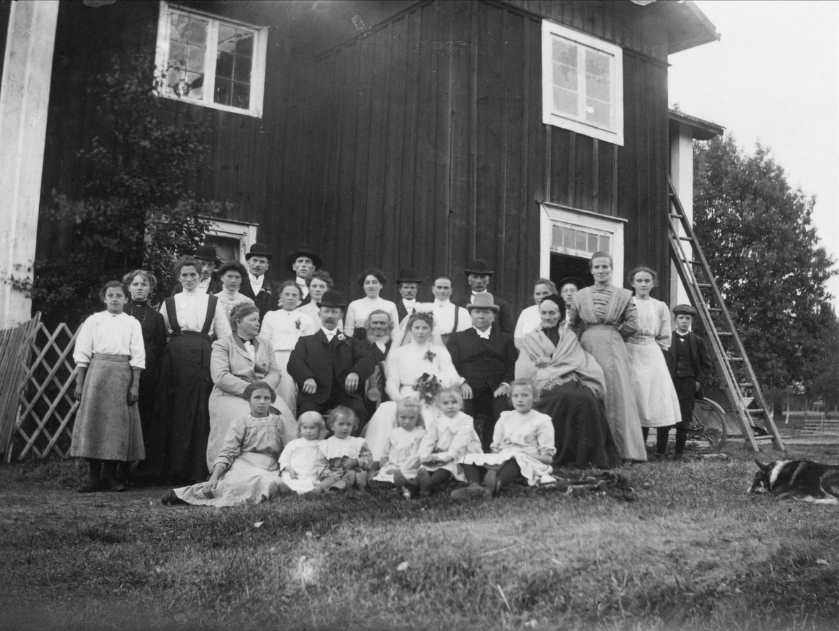 "Bröllop i Lispa". Gruppbild med brudpar sittande i mitten.