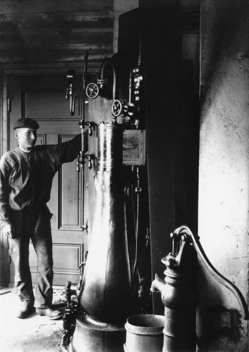 Elmer Larsson vid ångmaskin. Hos Valdemar Samuelssons snickeriverkstad, Biskopsbyn, Lima
