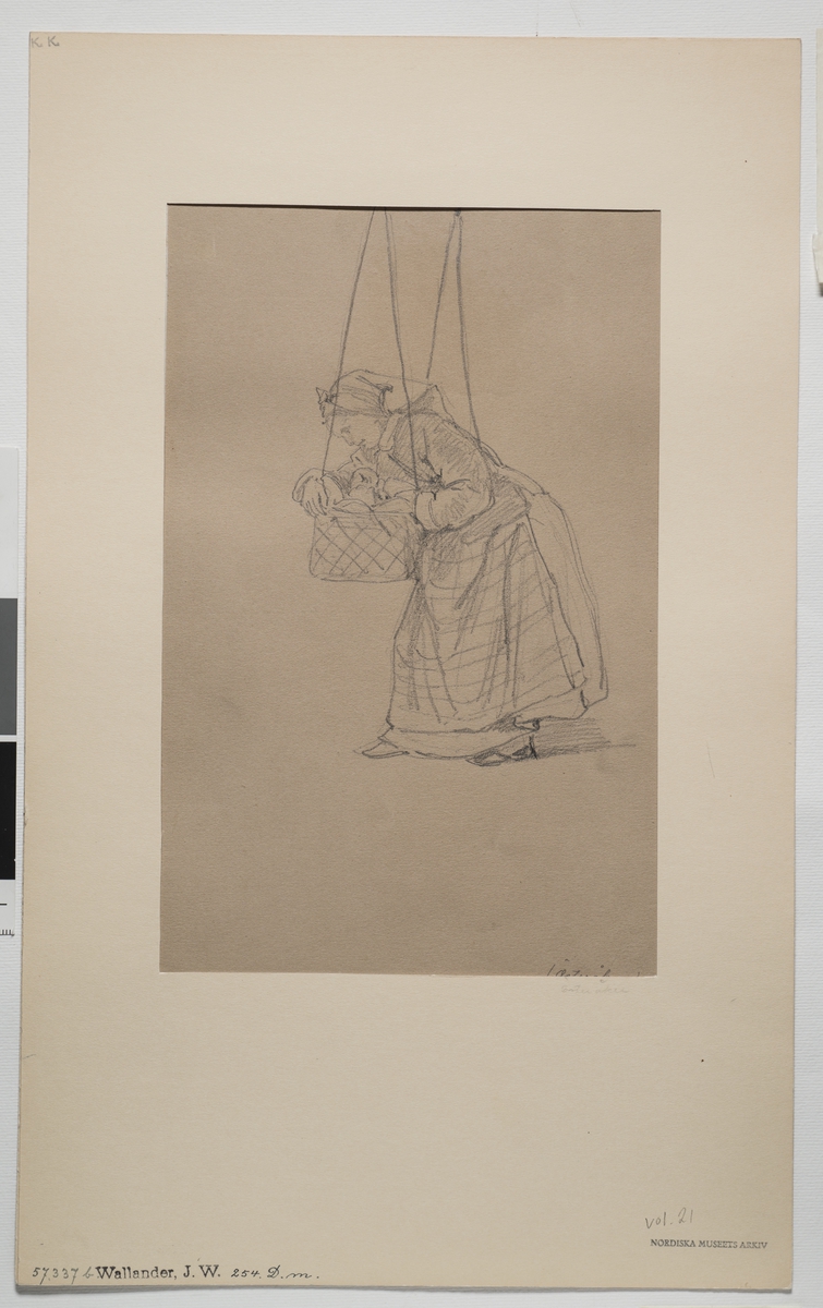 Blyertsskiss. En kvinna i helfigur och profil, står lutad över en hängande vagga av spån. J.W. Wallander.