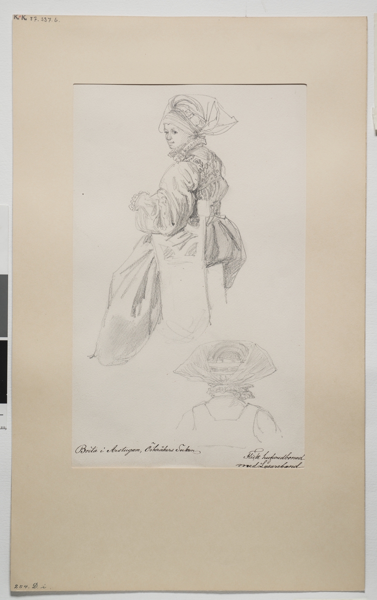 "Brita i Arstugan, Österåker socken." Blyertsskiss av en sittande ung kvinna i helfigur, samt detaljskiss av huvudbonad ,med texten: "Flickhufvudbonad med Lysareband" J.W. Wallander.