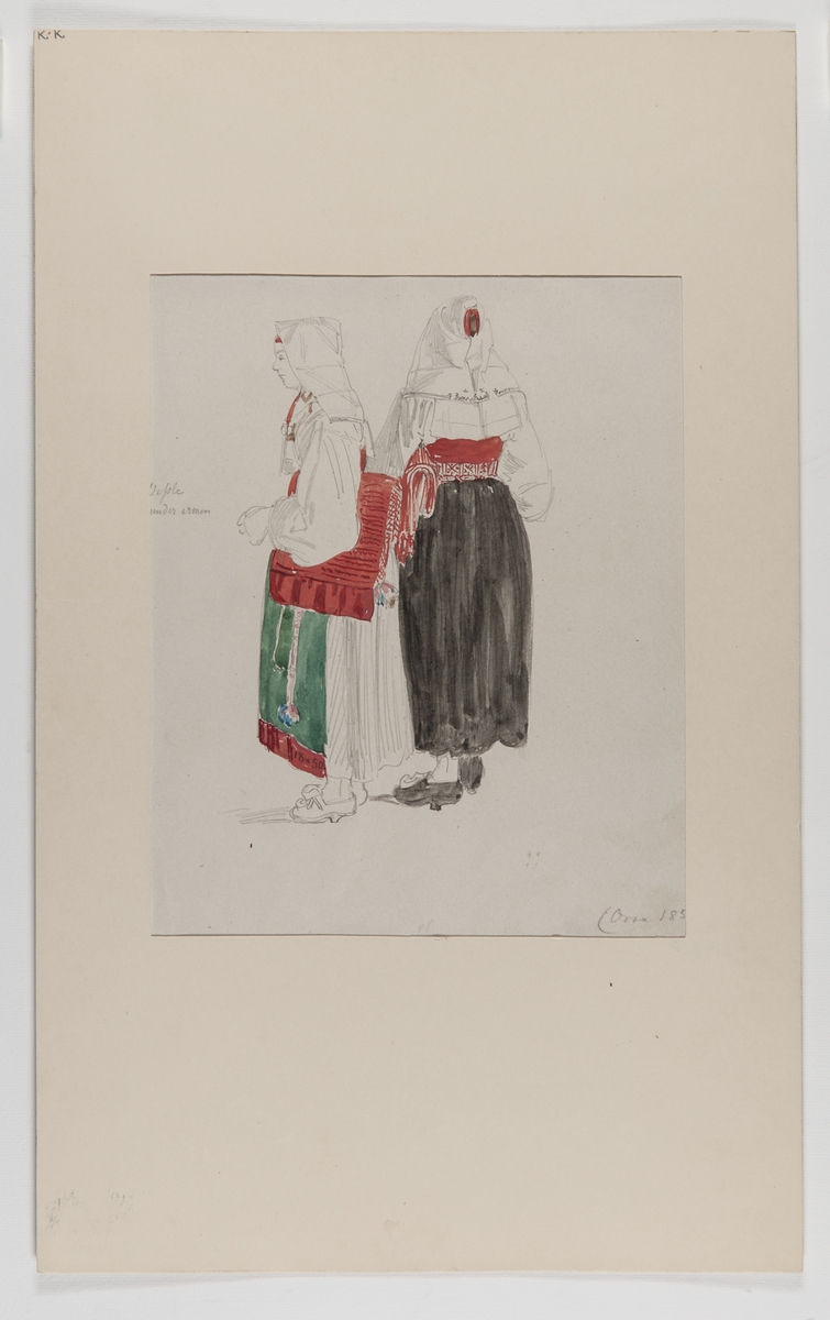 Akvarellerad handteckning av J W Wallander. Kvinnodräkt från Orsa, Dalarna 1850. Nordiska museeets inventarienummer 57339m