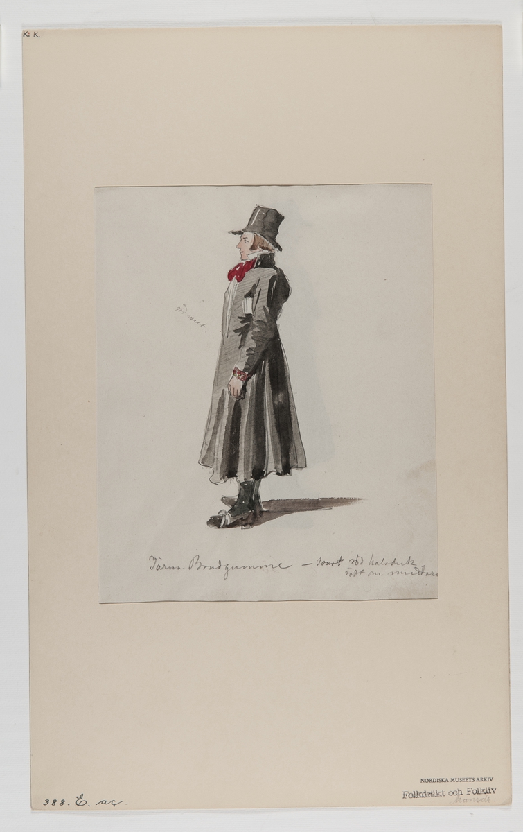 Akvarellerad handteckning. Mansdräkt från Järna, Dalarna. "Järna Brudgumm".