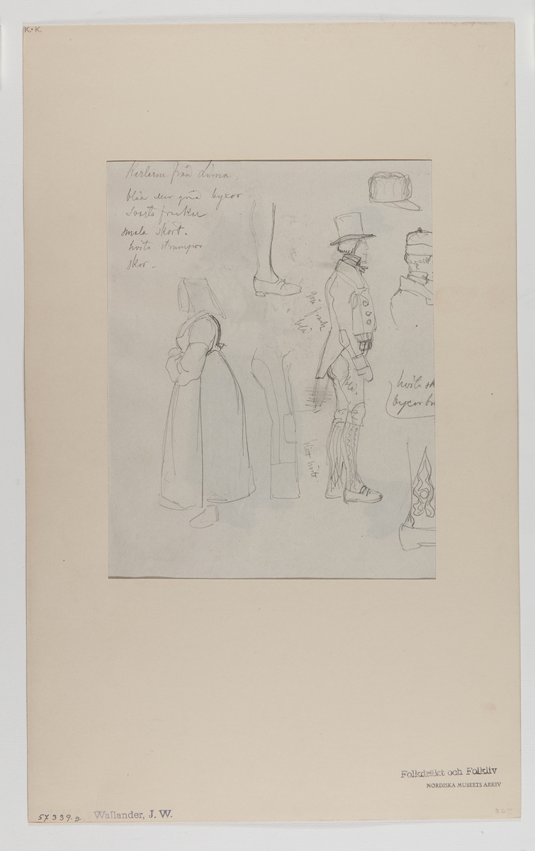 Handteckning av J W Wallander. Mans och kvinno-dräkter från Lima, Dalarna. "Karlarne från Lima [---]. Nordiska museet inv nr 57339g.
