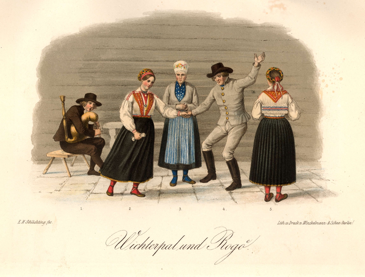 Dansande och musicerande sällskap i allmogedräkter från Rågö, Estland. "Wichterpal und Rogö". Litografi från förlaga av E H Schlichting.
