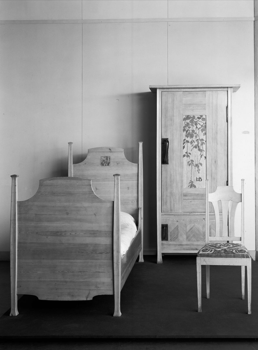 Säng och skåp av furu, stol av björk, vitlaserade med inlagda motiv av färgat trä. Delar av sängkammarmöbel ritad av Carl Westman 1901. Utställningen Svensk jugend.