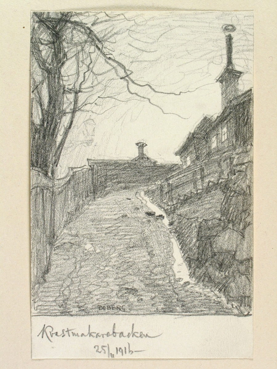 Teckning av Ferdinand Boberg. Stockholm, Söder, Kv. Kvastmakarebacken