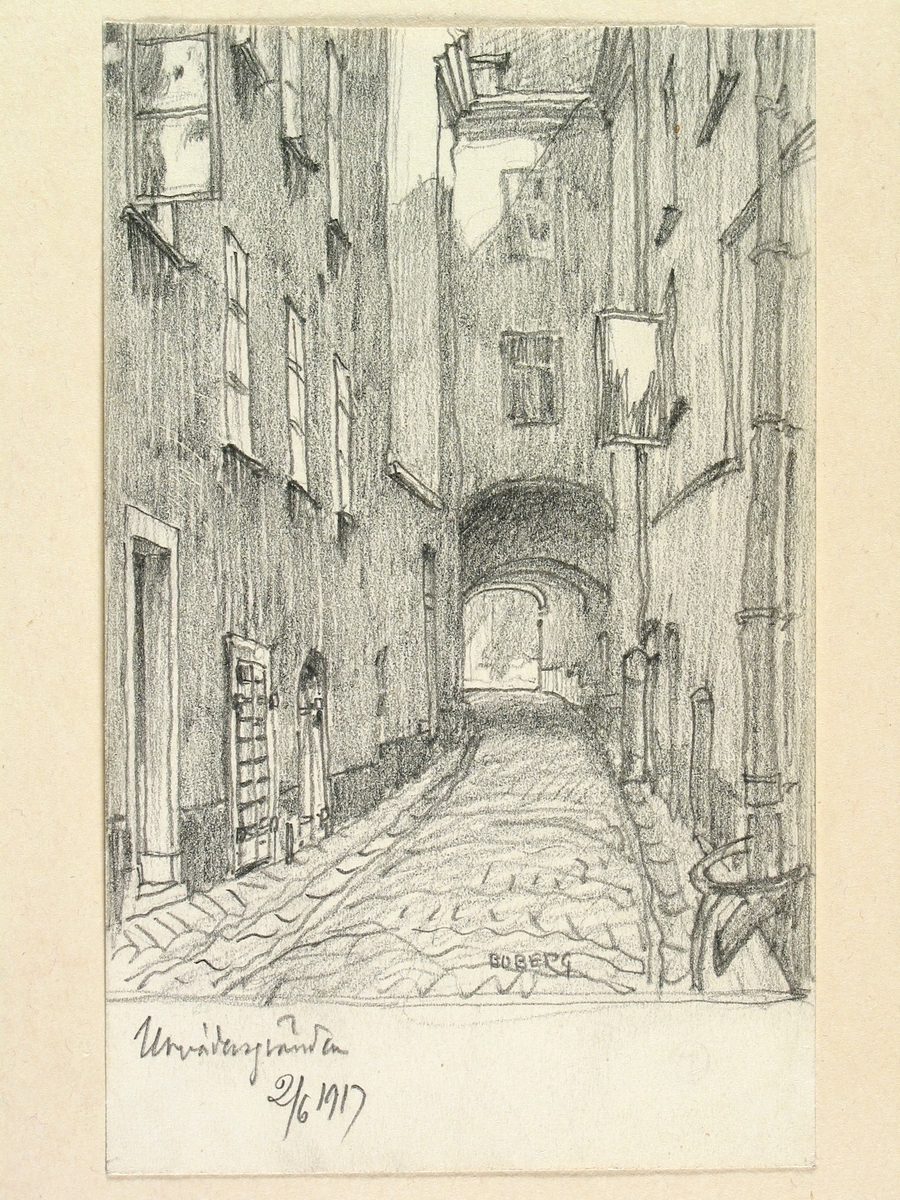 Teckning av Ferdinand Boberg. Stockholm, Staden inom broarna, Urvädersgränd