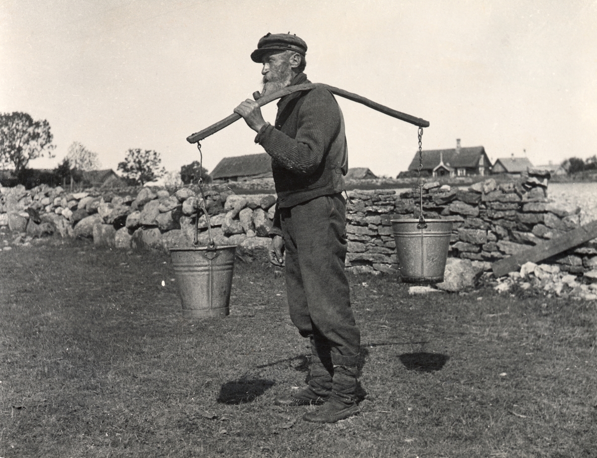"Estland. Lilla Rågö. Bonde som bär vatten på bärträ över ena axeln."