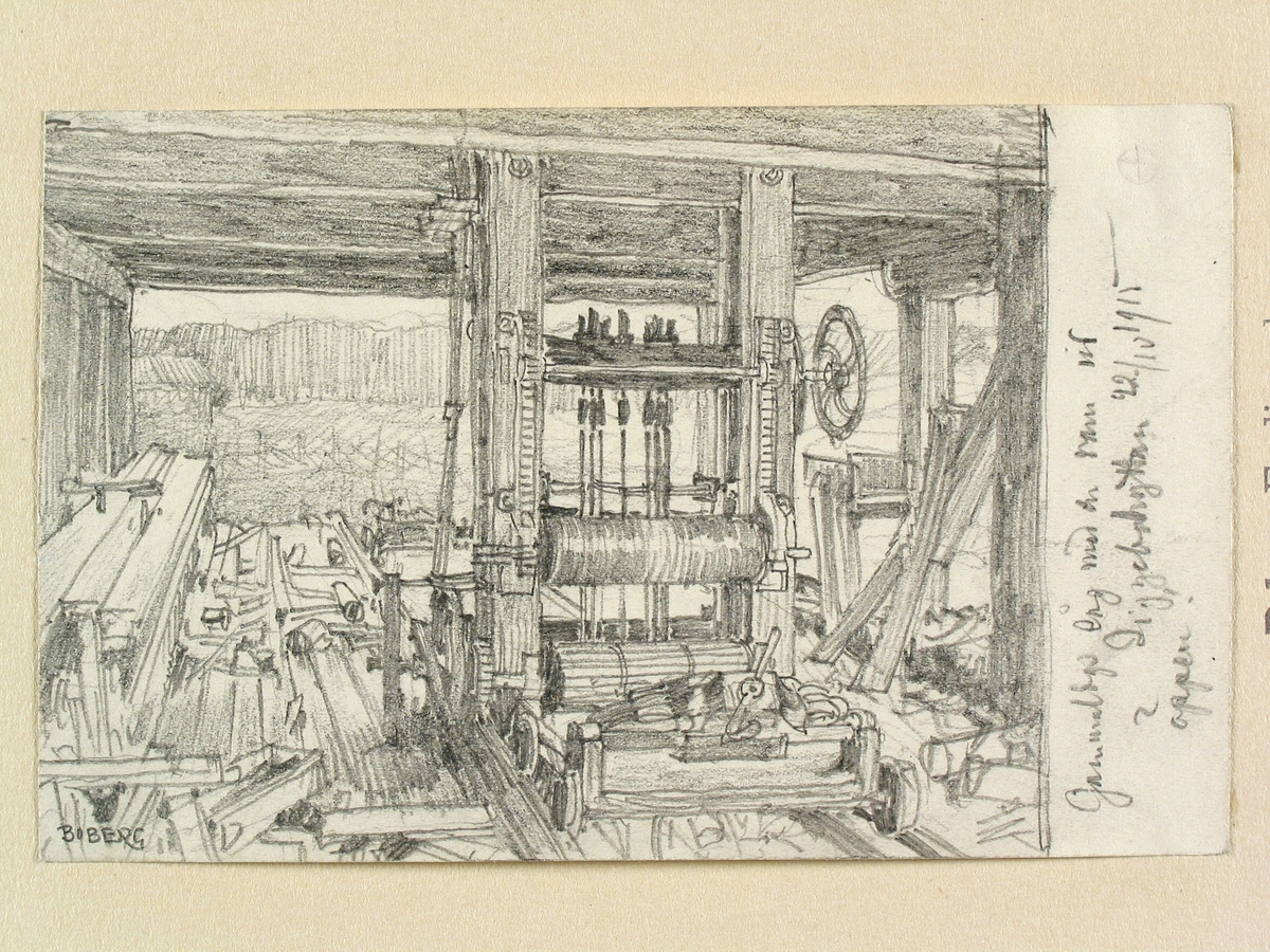 Västmanland, Lindesbergs landsförsamling, Siggebohyttan. "Gammaldags såg med en ram vid Siggebohyttan". Teckning av Ferdinand Boberg.