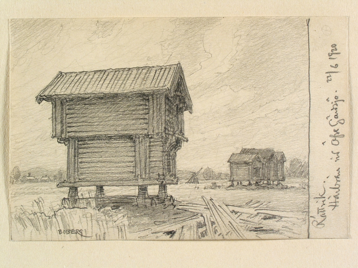 Dalarna, Rättviks sn. Härbren vid Övre Gärdsjö. Teckning av Ferdinand Boberg
