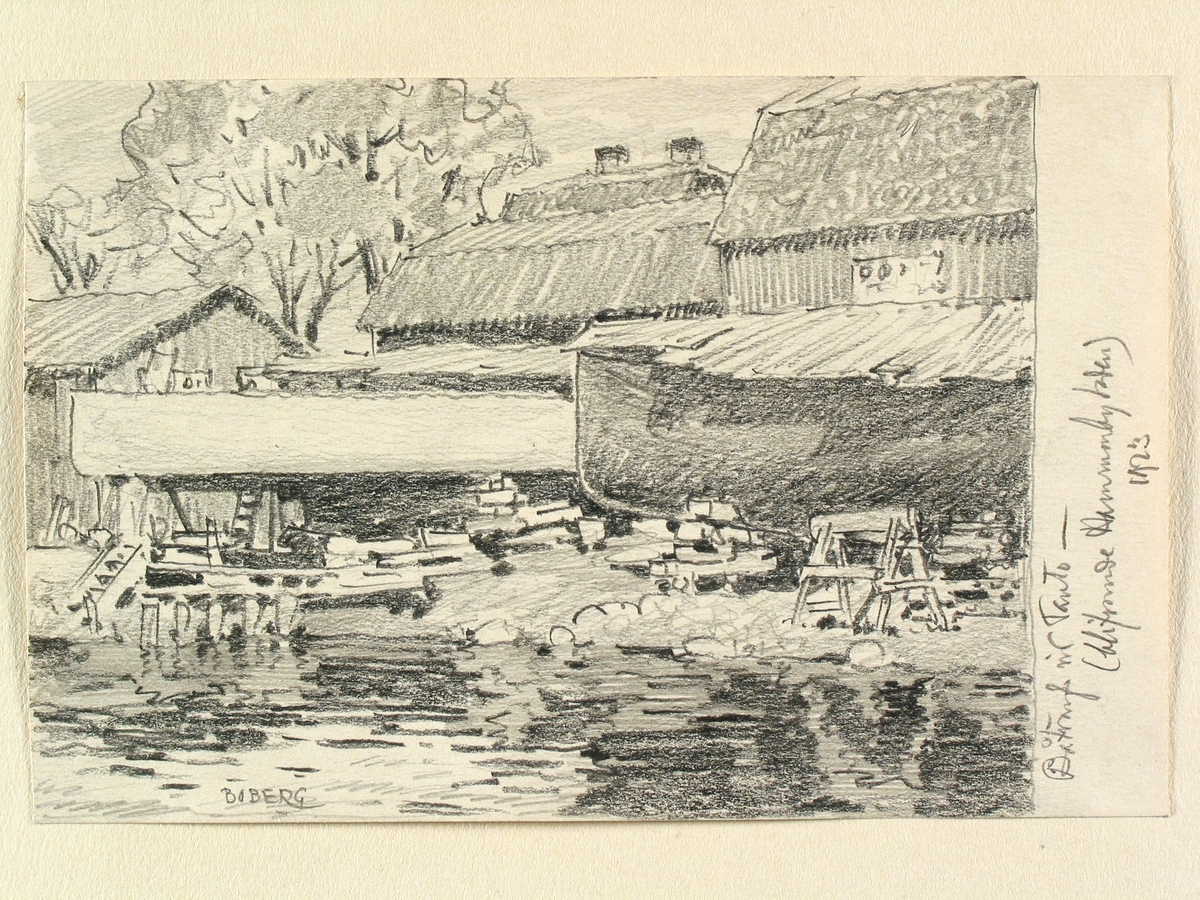 "Båtvarf vid Tanto blifvande Hammarbyleden 1923" Stockholm, Söder, Teckning av Ferdinand Boberg. Varv.