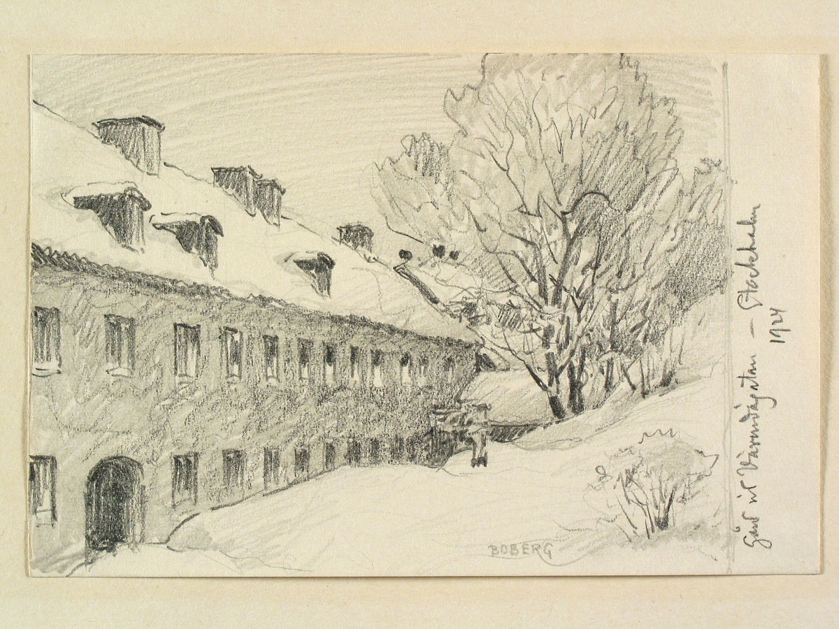 Gård vid Värmdögatan (idag 2017 )Malmgårdsgatan) Stockholm, Södermalm, 1924, Teckning av Ferdinand Boberg.