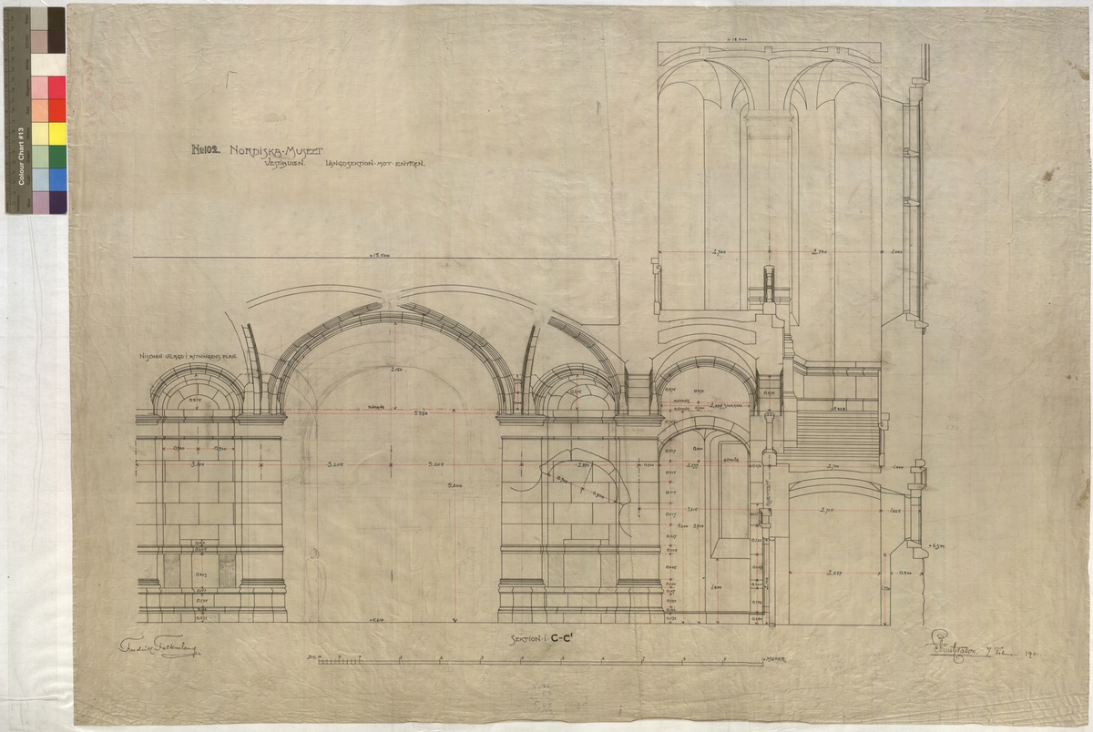 No 102 Nordiska museet. Vestibulen. Längdsektion mot entren.