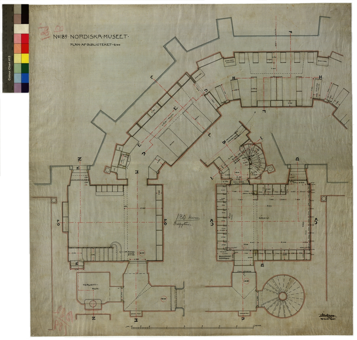 No 189. Nordiska Museet. Plan af biblioteket 8,210. Arkiv. Toalettrum. Brandpost.
