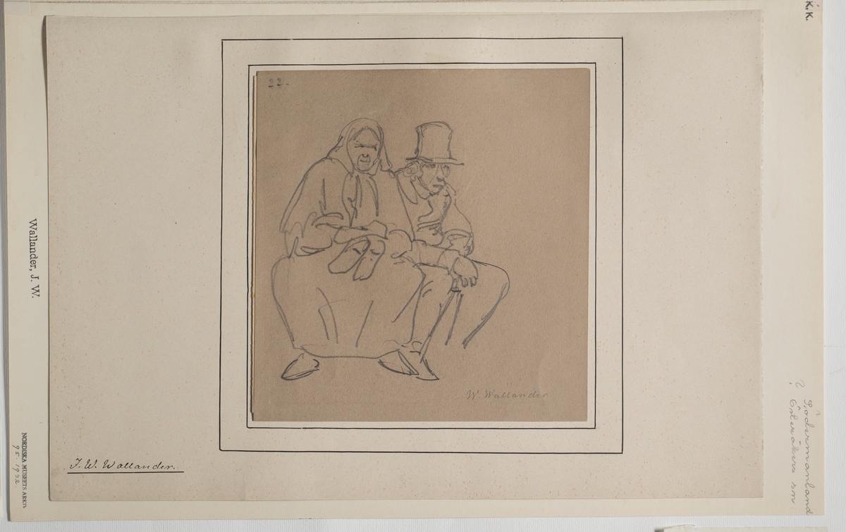 Blyertsskiss av sittande kvinna och man . J.W. Wallander. Södermalnland, Österåker sn. (?)