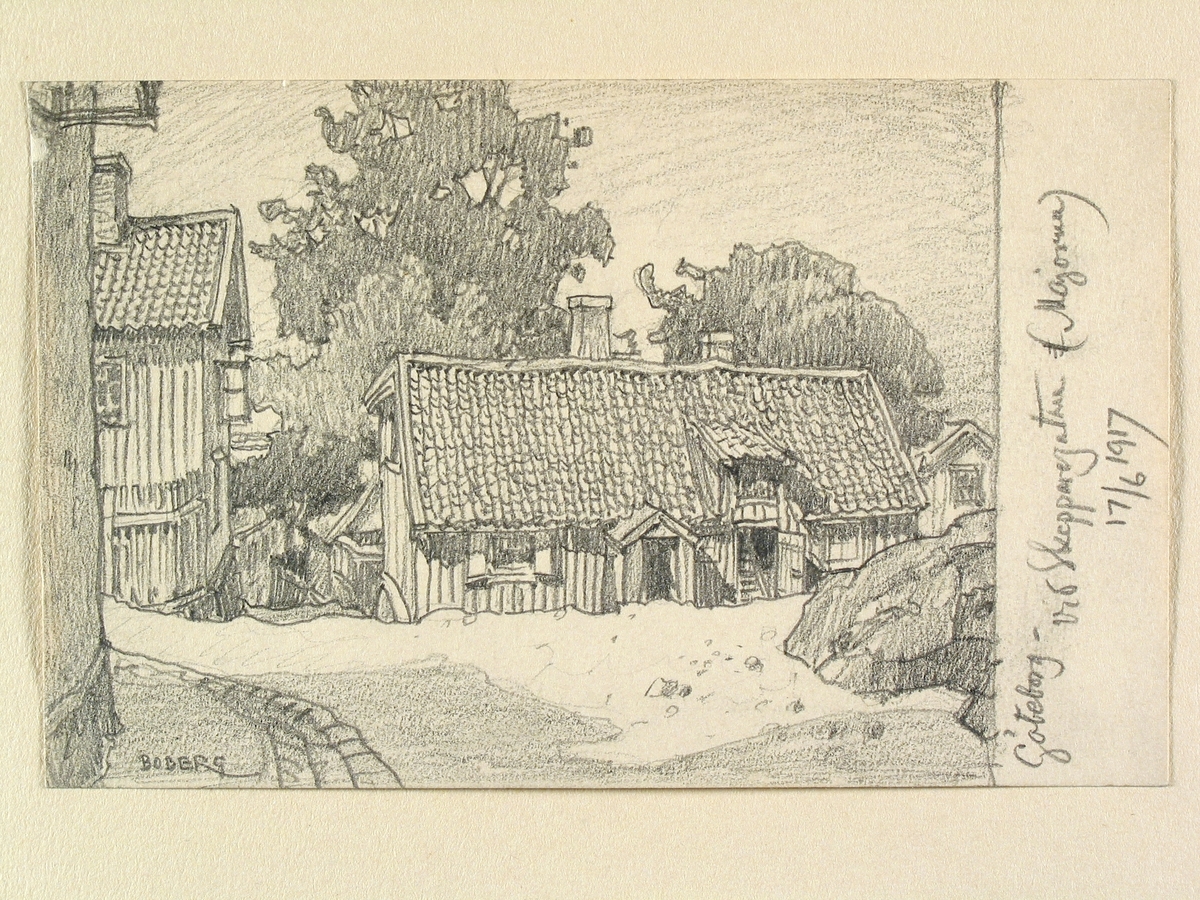 Teckning av Ferdinand Boberg. Göteborg , Majorna, Skepparegat.