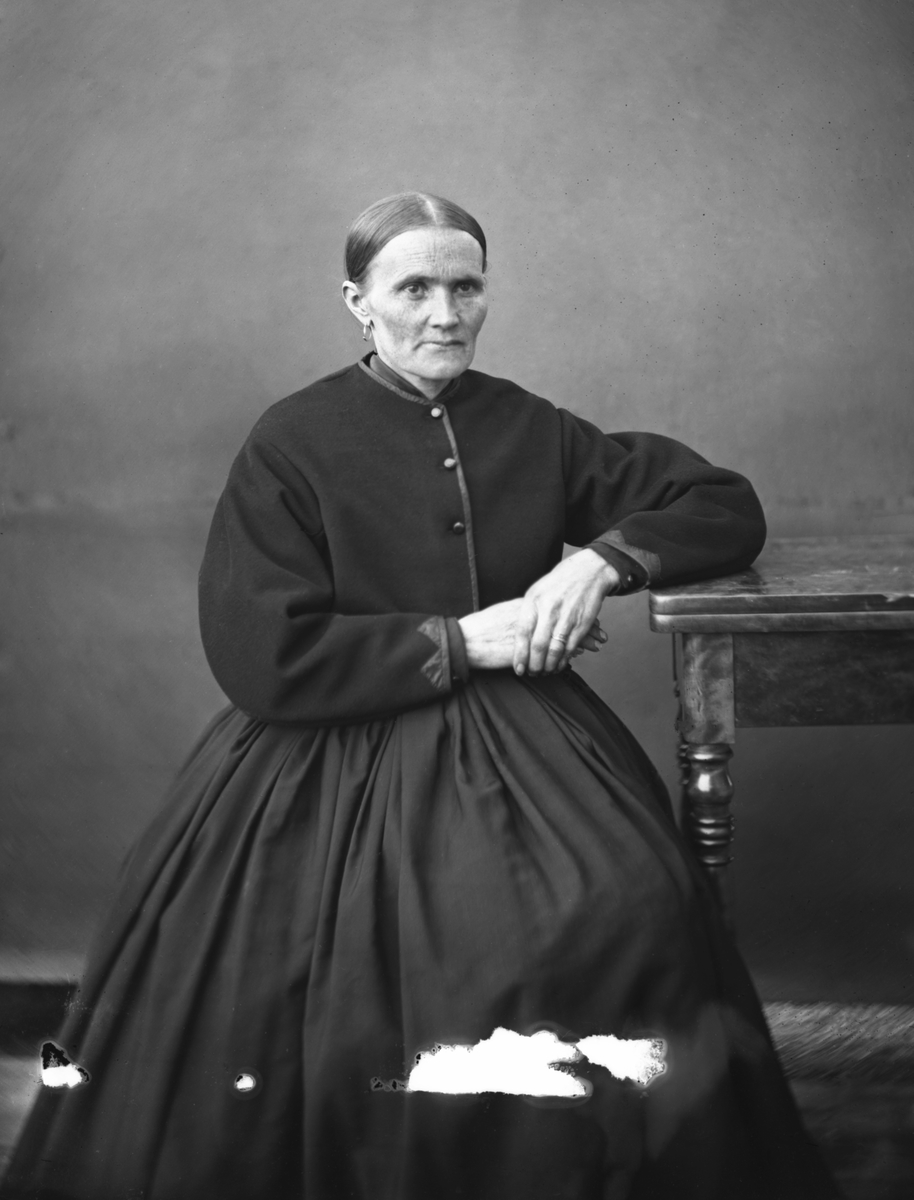 Porträtt av äldre kvinna i svart kjol och tröja. Kvinnans frisyr är slätkammad med mittbena och hon ser allvarligt in i kameran.