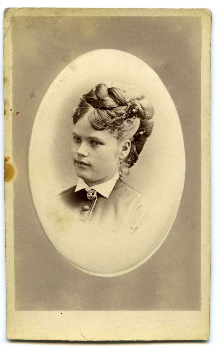 Ung kvinna med konstfull frisyr med blomformade hårsmycken, örhängen och brosch. 1870-tal.