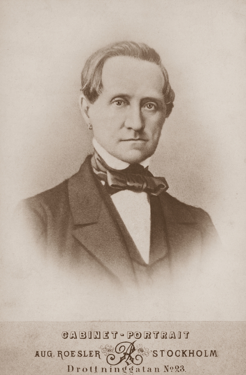 Kabinettsporträtt, bröstbild, föreställande man iklädd kostym med väst och fluga. I ena örsnibben sitter ett örhänge - en ring.