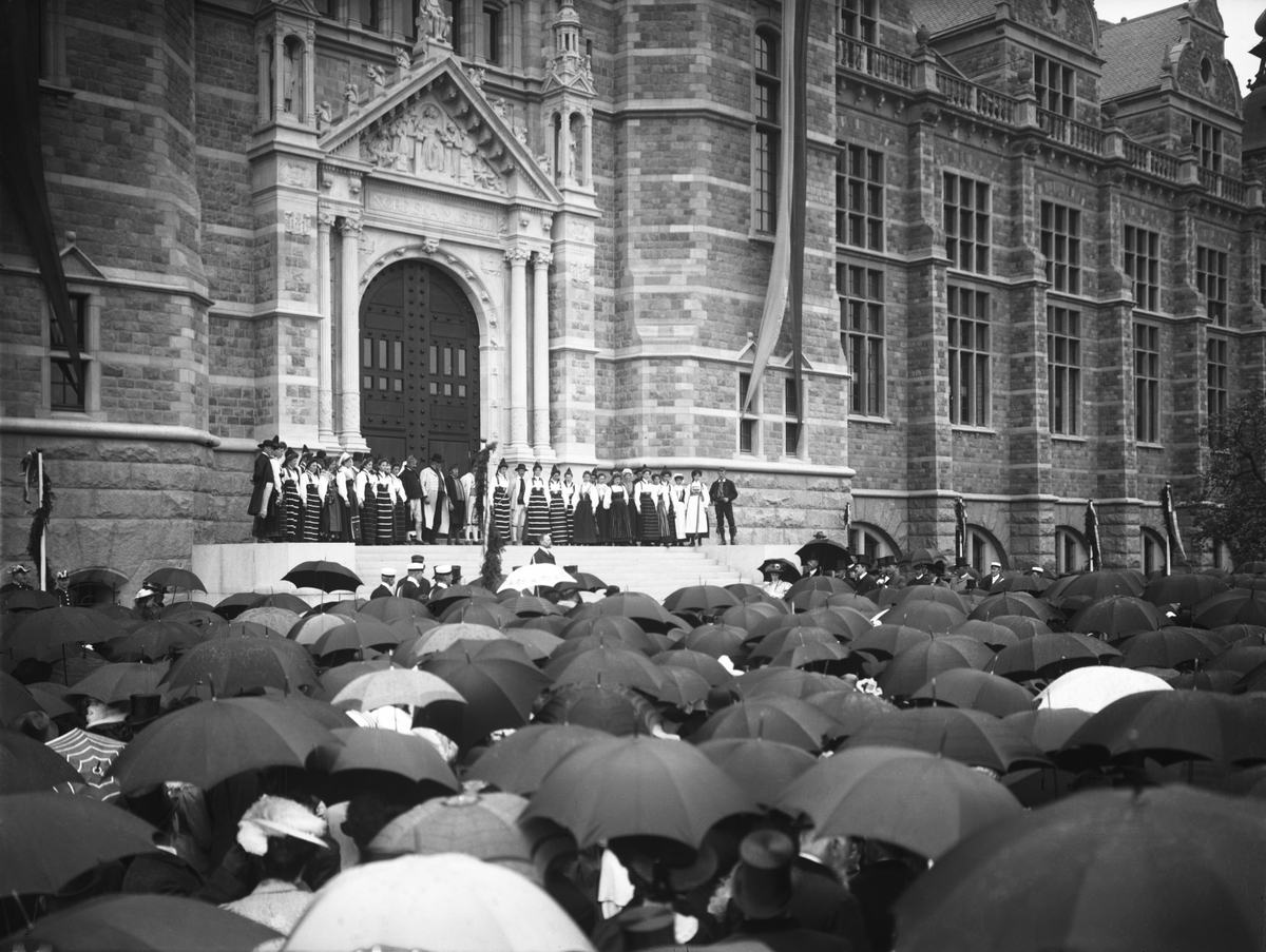 Nordiska museets invigning 1907. Åskådare med paraplyer i förgrunden.