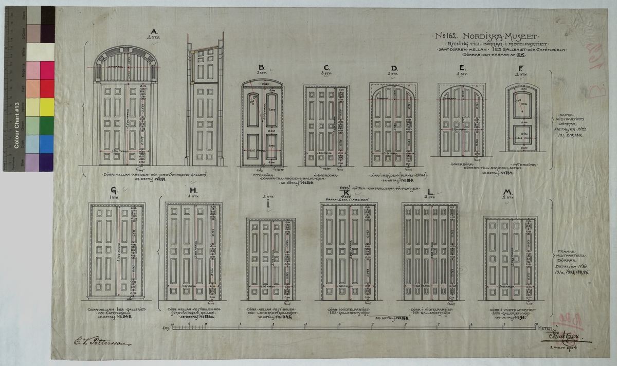 No 162 Nordiska Museet. Ritning till dörrar i midtelpartiet samt dörren mellan 1sta Galleriet och Caféflygeln. Dörrar och karmar af ek. Dörr mellan absiden och jordvåningens galleri.