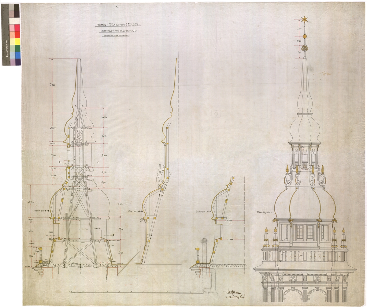 No 202. Nordiska museet. Midtelpartiets tornhufvar. Sektioner och fasad.