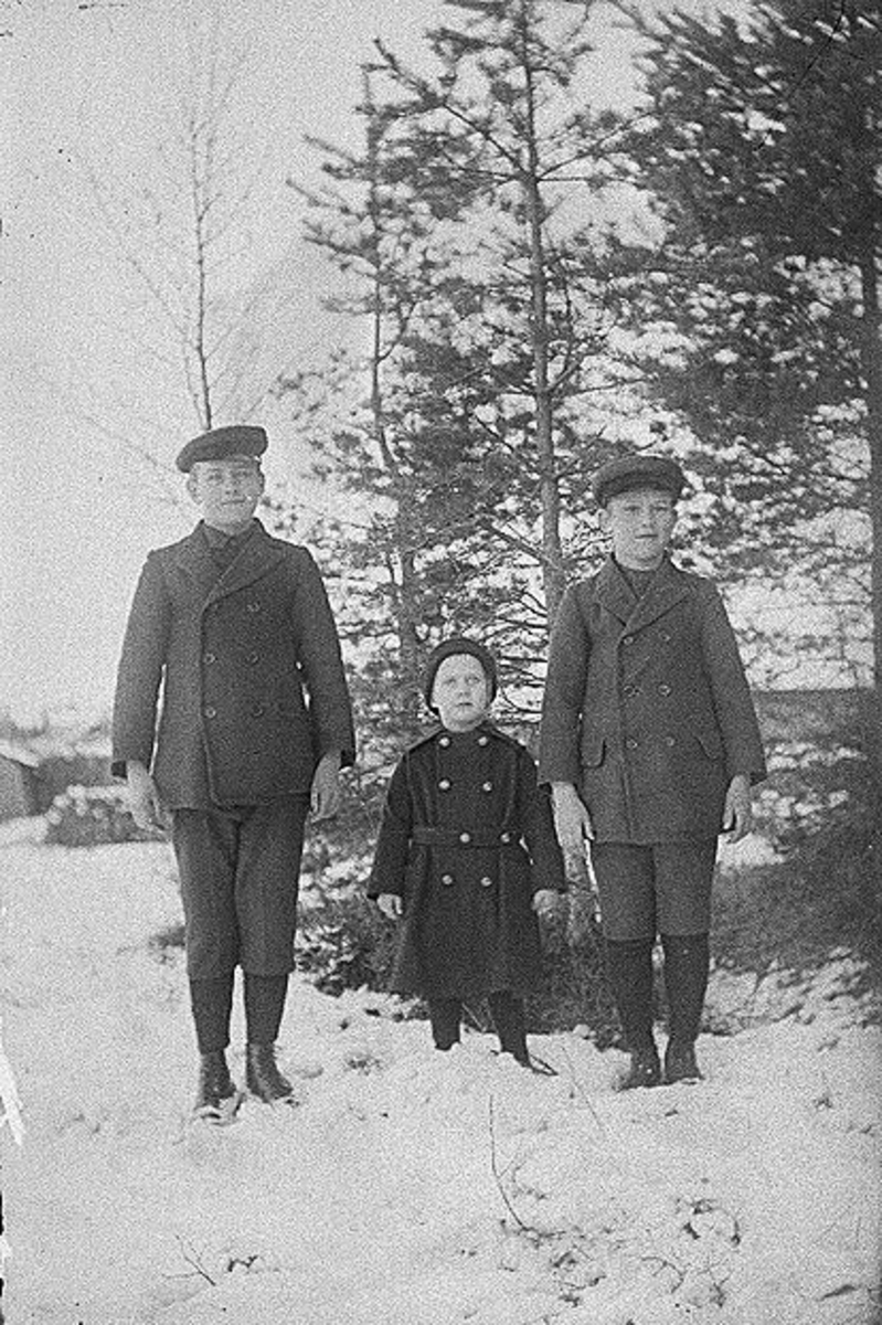 Grupporträtt av två pojkar och en liten flicka i vinterlandskap. Lima, Dalarna