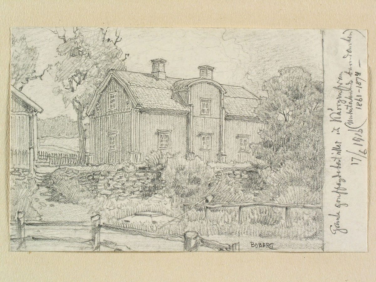Teckning av Ferdinand Boberg. Västmanland, Gamla Norbergs blg., Norbergs sn, Kärrgruvan. Med påskift: "Gamla Gruvfogdebostället vid kärrgruvan (undertecknads barndomshem 1861-1874) 17/6 1916"