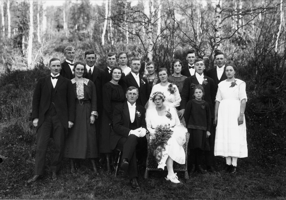Bröllop i Skålmo, Lima mellan Elis Andersson från Rämshyttan och Johanna Ezelius från Skålmo. Gruppbild med brudparet i mitten.