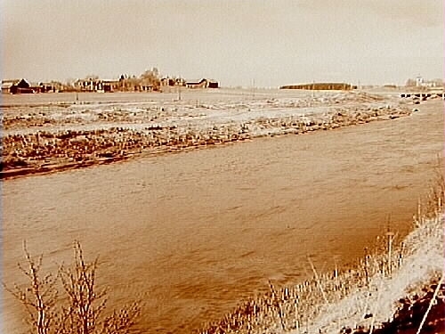 Spånga by till vänster och till höger Vintrosa kyrka, bron över Svartån.
