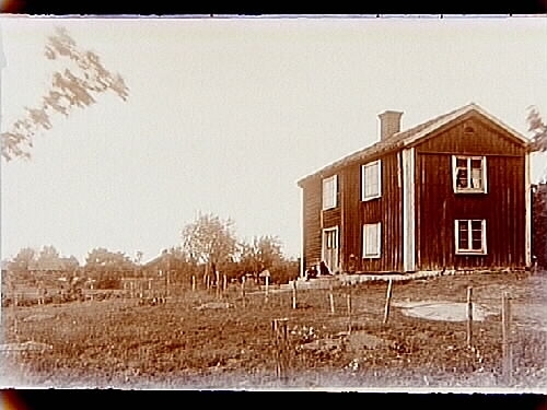 Tvåvånings enkelstuga, en pojke med hund på trappan.