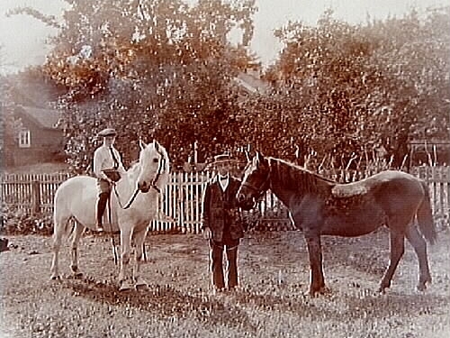 En pojke till häst och en man med häst.