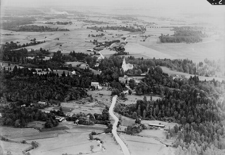 Flygfoto över Hidinge. Hidinge kyrka, bostadshus.