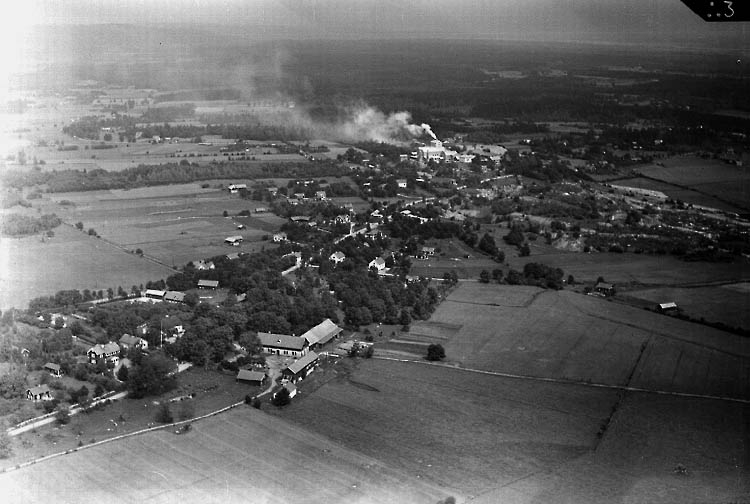 Titel: Flygfoto över Lanna, bostadshus och fabriksbyggnader, Lanna kalkbruk.